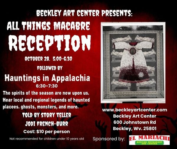 This October, Beckley Art Center invites you to embrace the mysterious and the supernatural with our juried exhibition, All Things Macabre — a showcase of dark beauty, haunting emotion, and eerie imagination. Regional artists explore themes of mortality, myth, and the unknown through painting, sculpture, photography, and mixed media, offering a chillingly captivating experience that celebrates the spirit of the season.